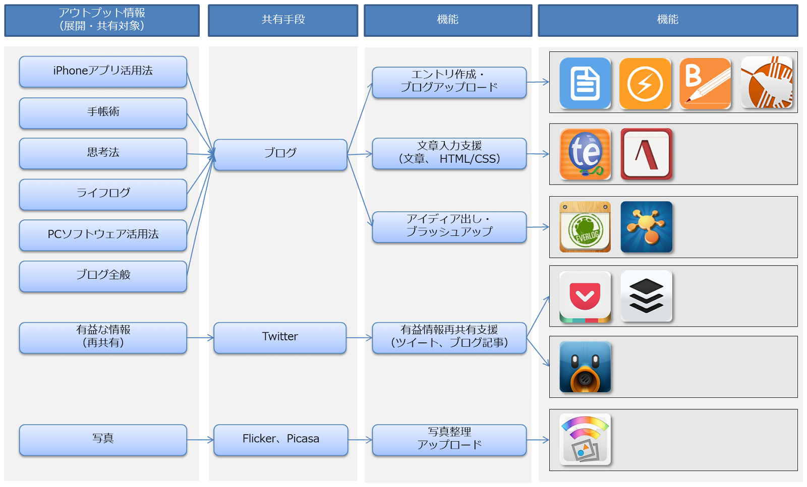 自分自身から外部への情報展開・共有に焦点をあてます。対象となる情報を如何にその目的にあわせて効率よく、情報を展開・共有できるかがこのプロセスの命題になります。したがって、本エントリでは、「情報の展開(作成含む)・共有を効率化してくれるiPhone神アプリ」を紹介したいと思います。